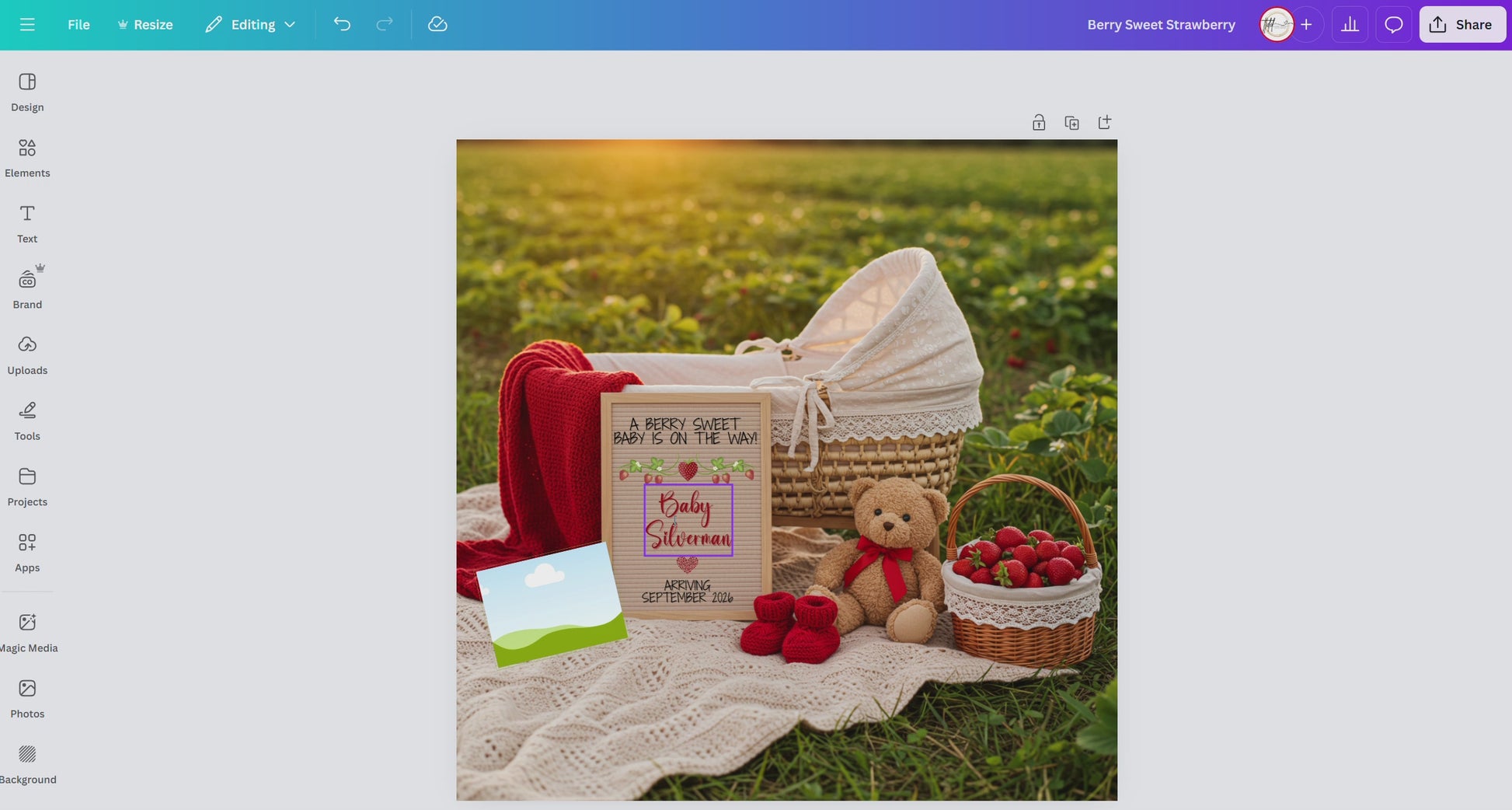 This carefully crafted template features a vibrant blend of reds and golden hues, making it suitable for announcing the arrival of either a boy or a girl. The design showcases an adorable strawberry motif alongside a wicker bassinet set in a picturesque strawberry field, ensuring your announcement feels warm, unique, and memorable.